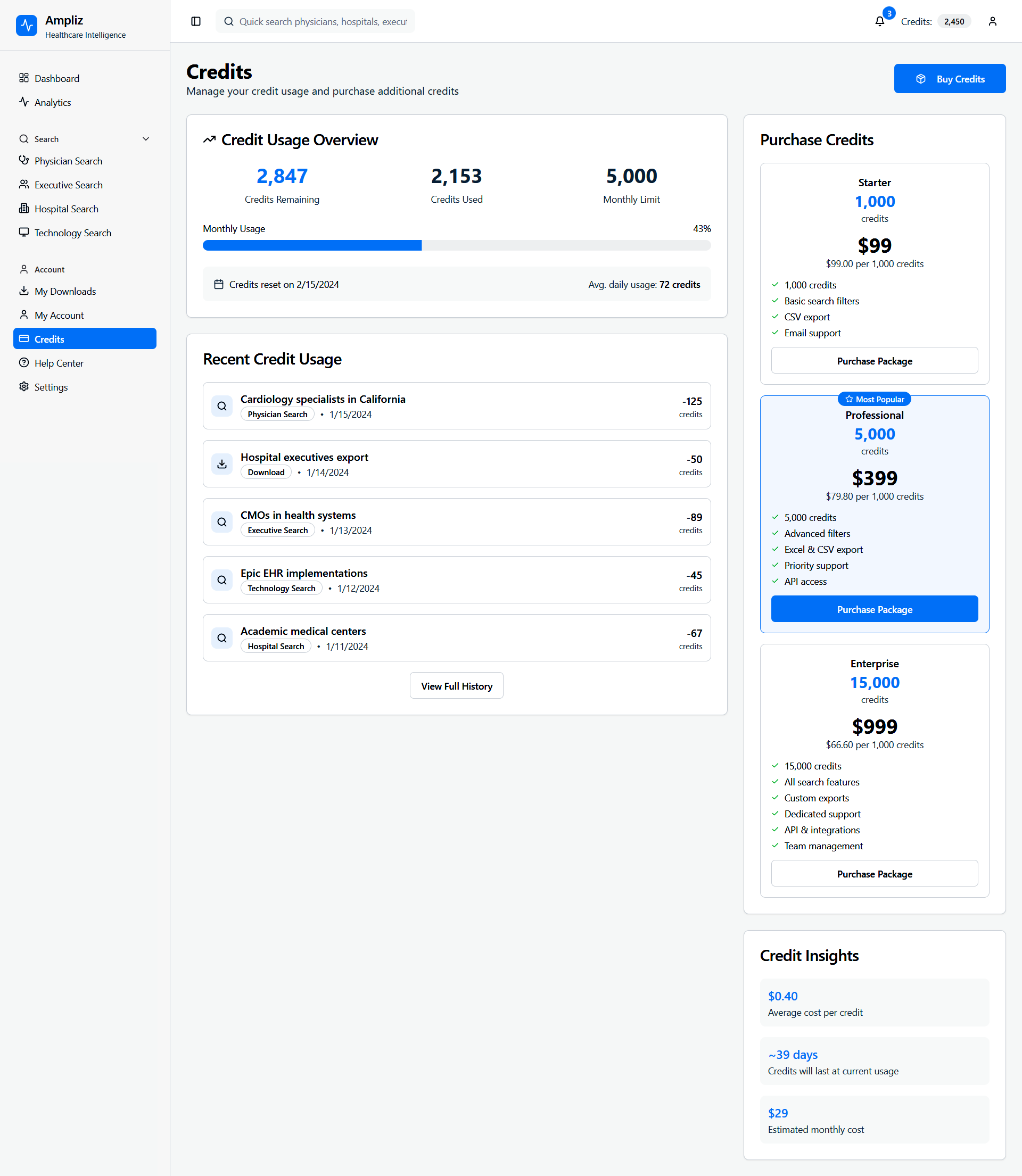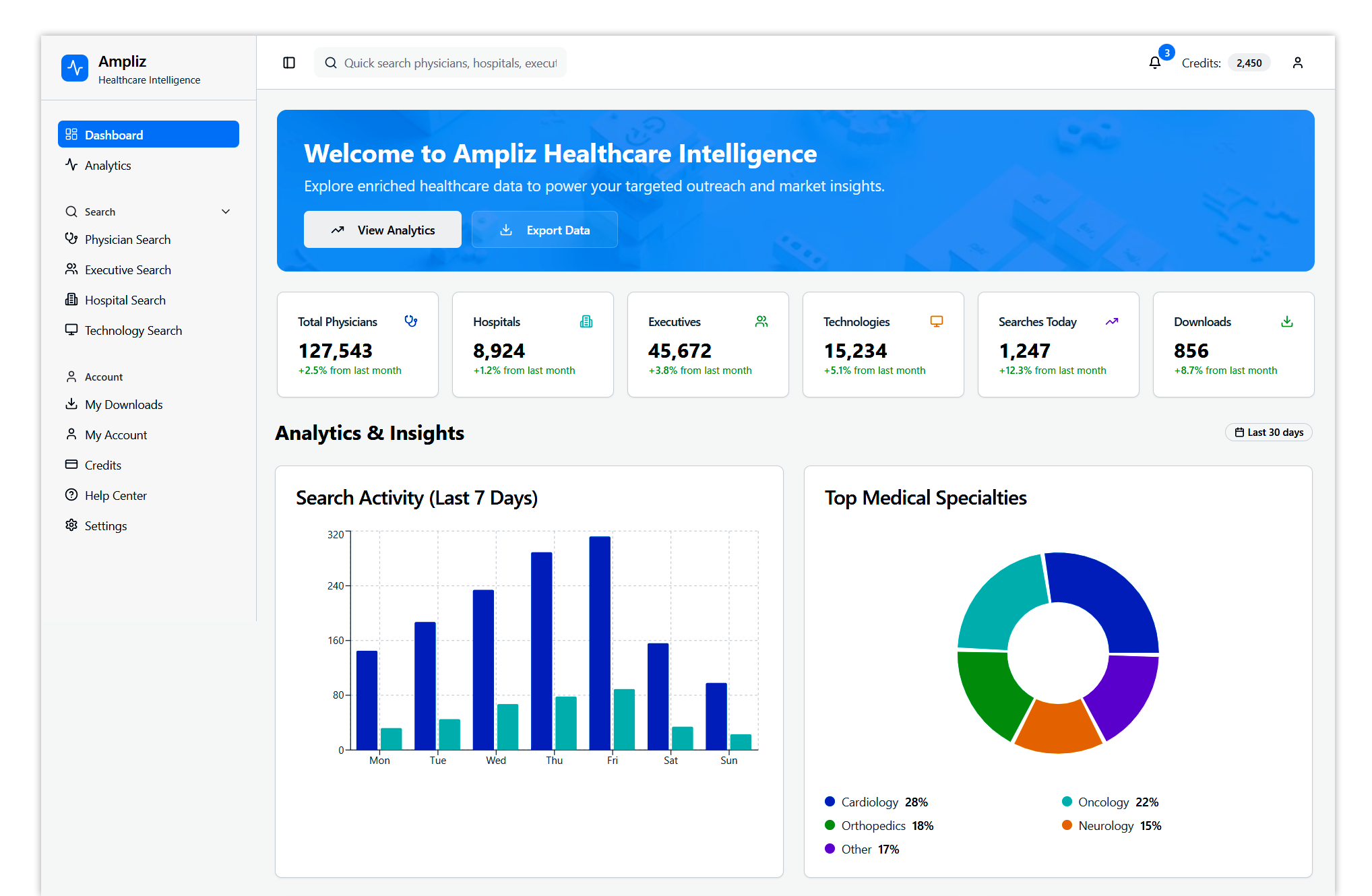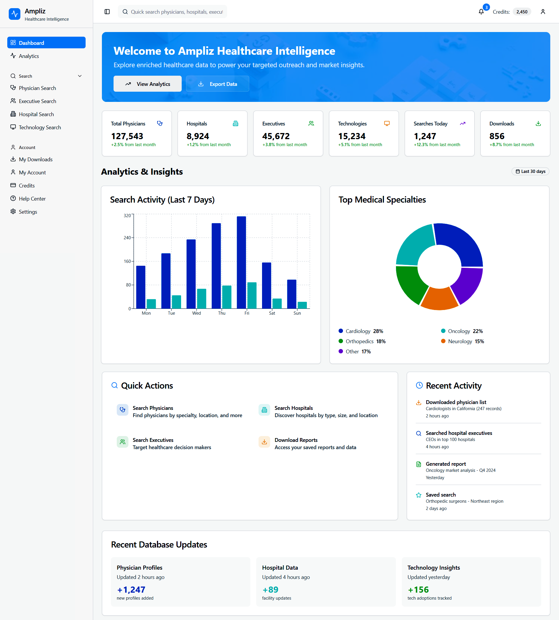 Ampliz Healthcare Intelligence is a web-based platform designed for healthcare marketers and sales teams to access enriched physician, hospital, and technology data. This redesign project focuses on improving data visualization, advanced search filters, and overall usability to help users make informed decisions, view detailed profiles, and download curated contact lists.