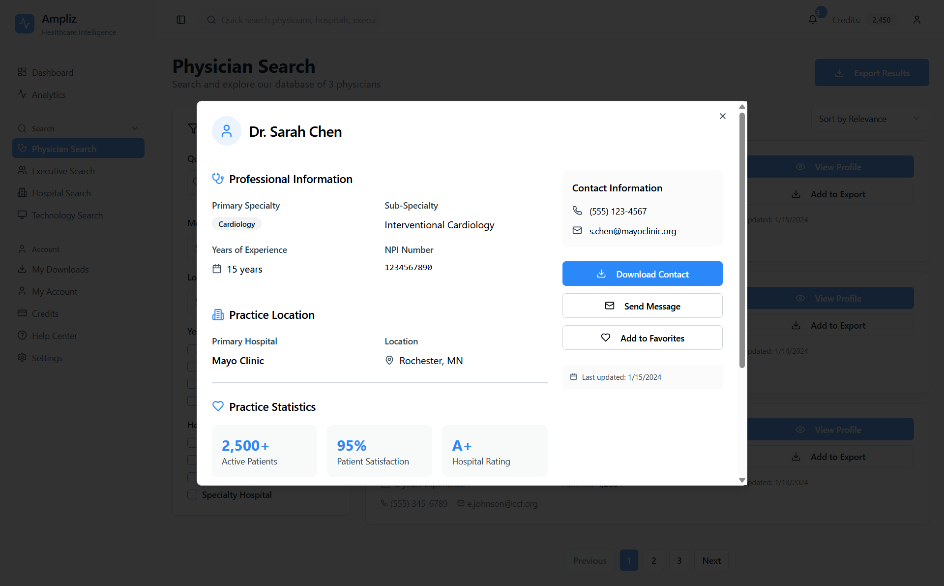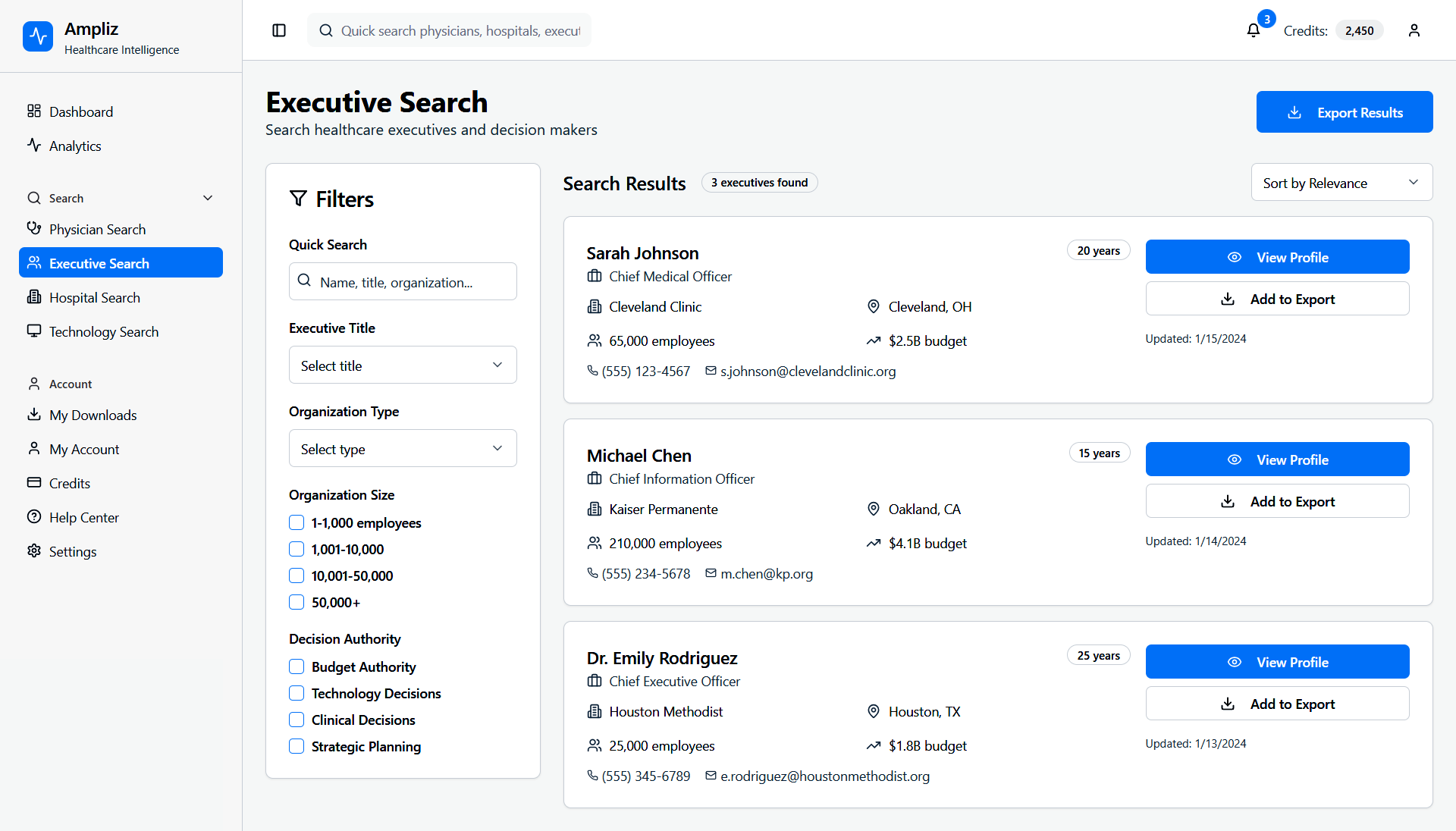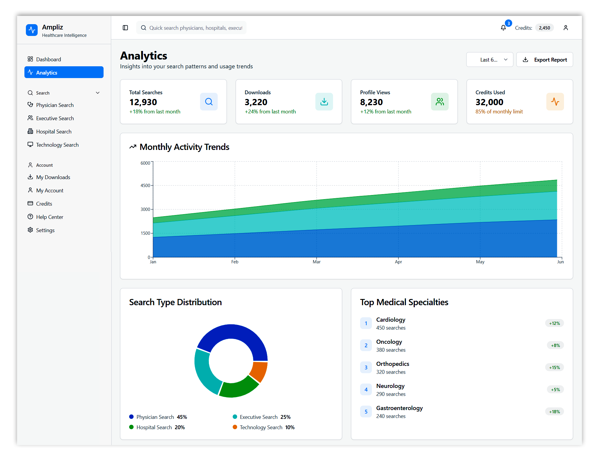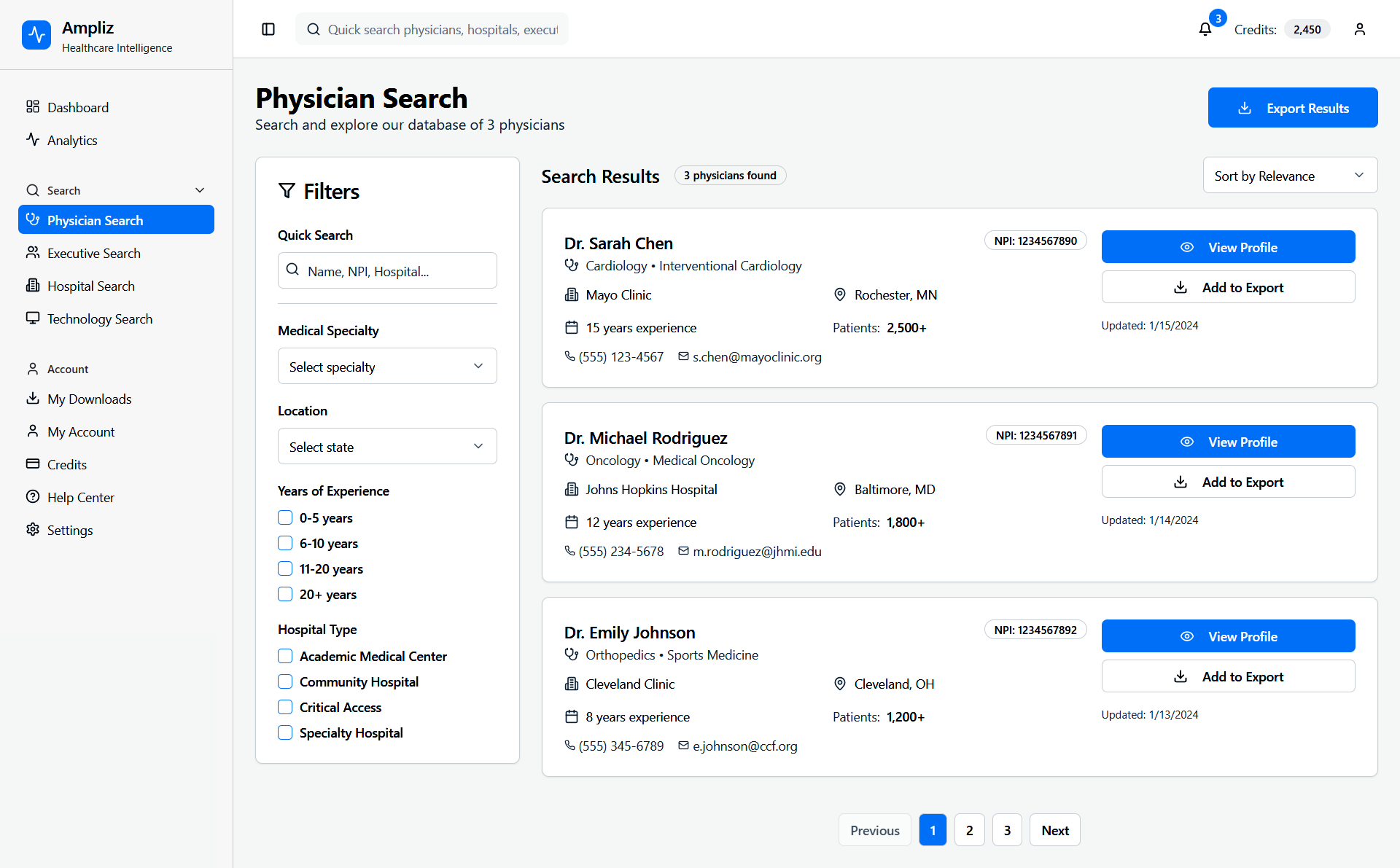 Ampliz Healthcare Intelligence is a web-based platform designed for healthcare marketers and sales teams to access enriched physician, hospital, and technology data. This redesign project focuses on improving data visualization, advanced search filters, and overall usability to help users make informed decisions, view detailed profiles, and download curated contact lists.