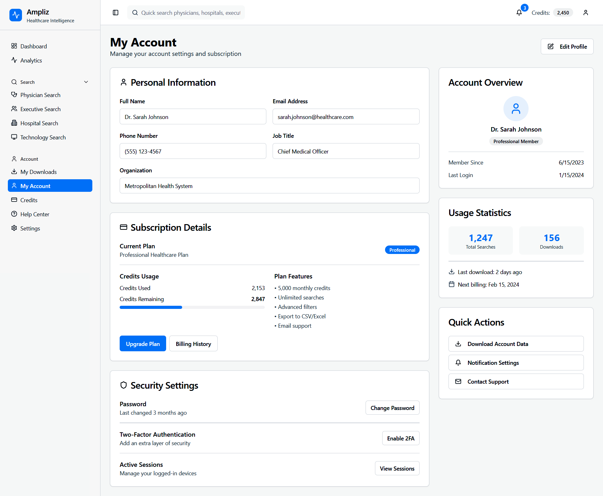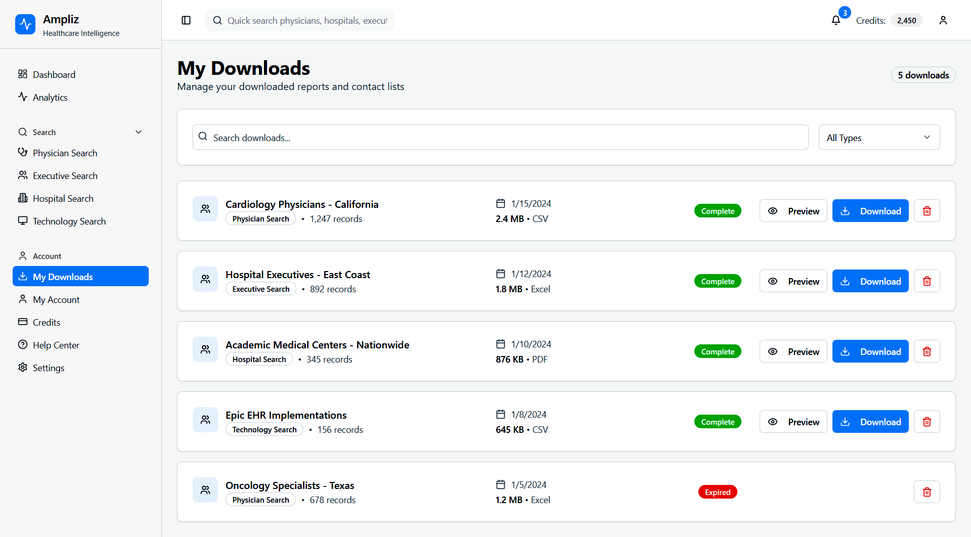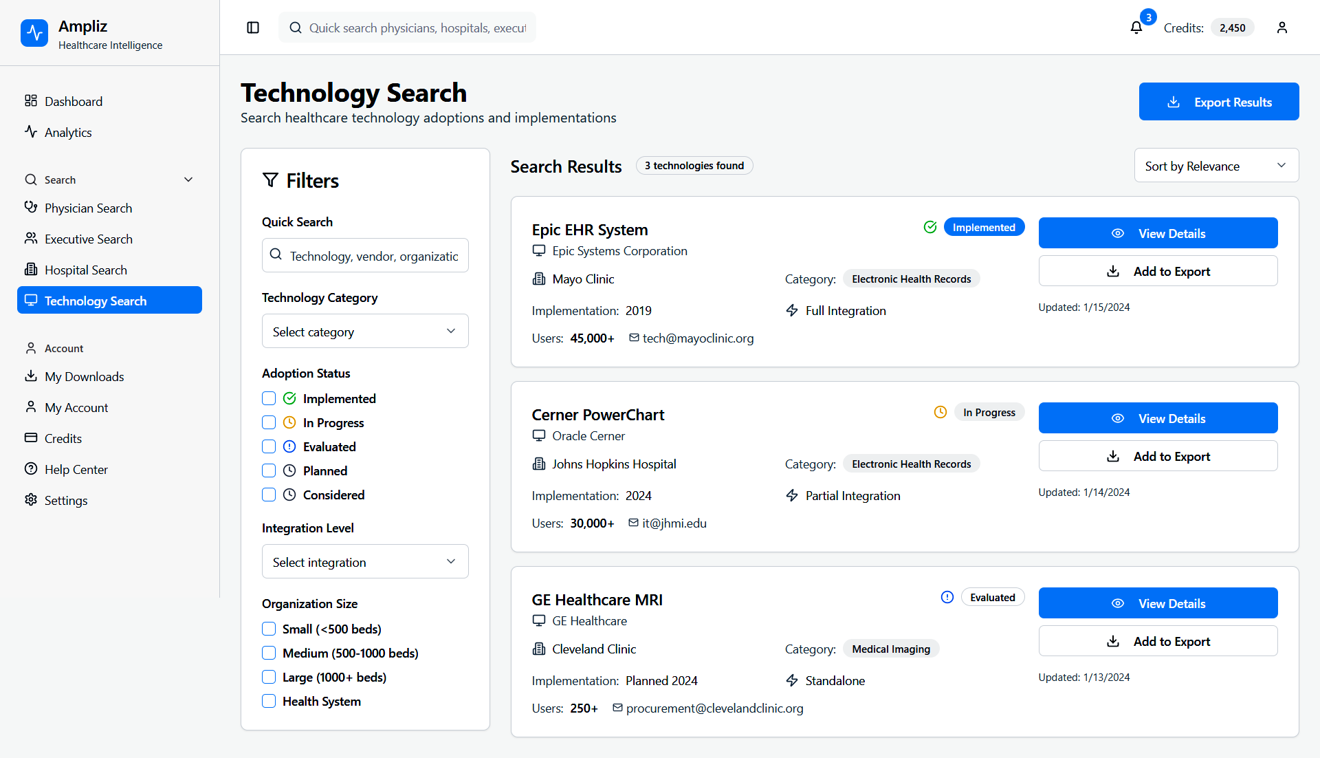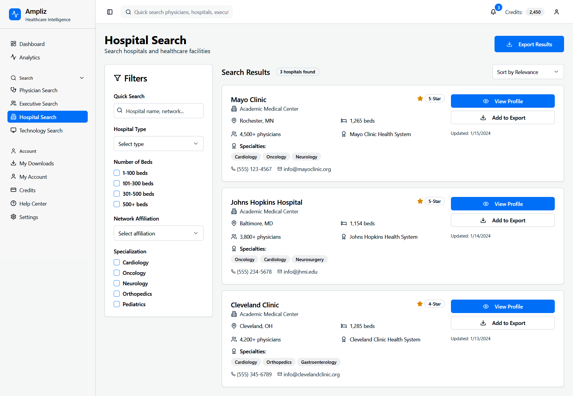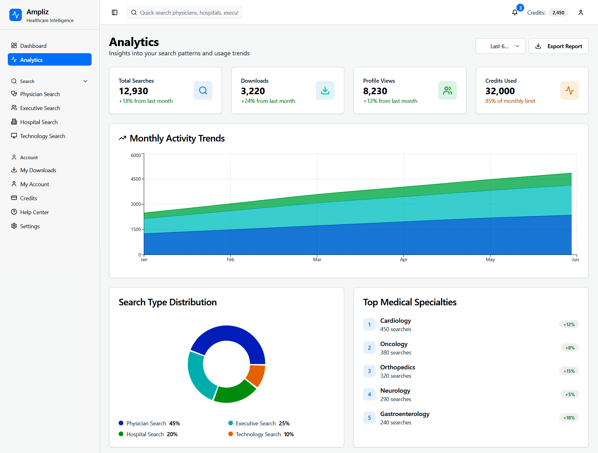 Ampliz Healthcare Intelligence is a web-based platform designed for healthcare marketers and sales teams to access enriched physician, hospital, and technology data. This redesign project focuses on improving data visualization, advanced search filters, and overall usability to help users make informed decisions, view detailed profiles, and download curated contact lists.